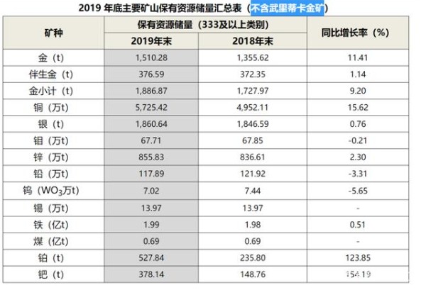 截止到2019年末,紫金礦業(yè)擁有2,130 噸金(含武里蒂卡金礦),黃金資源量超過國家央行黃金儲(chǔ)備量(截至2020 年2 月末,央行黃金儲(chǔ)備約1,948.32 噸),據(jù)《2019中國礦產(chǎn)資源報(bào)告》,中國金儲(chǔ)量為11443.49萬噸,紫金礦業(yè)儲(chǔ)量占據(jù)全國的18.61%。